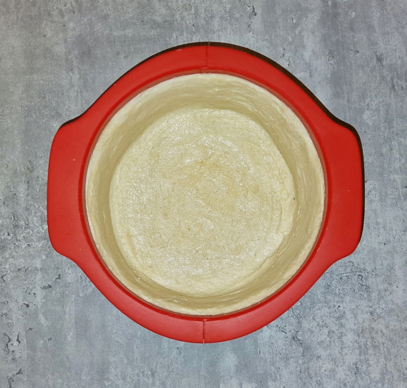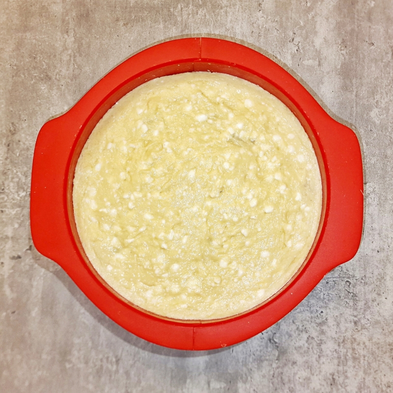 Für die Fülle die Hälfte vom Hüttenkäse, Eier, Quark, Mandelmilch, Zitronensaft, Süße, Abrieb 1/2 Zitrone miteinander vermixen, dann löffelweise den Käsekuchenzauber hinzufügen und 2 Minuten vermixen. Danach mit einem Löffel den zweiten Becher Hüttenkäse hinzufügen und mit einem Löffel unter die Masse rühren.