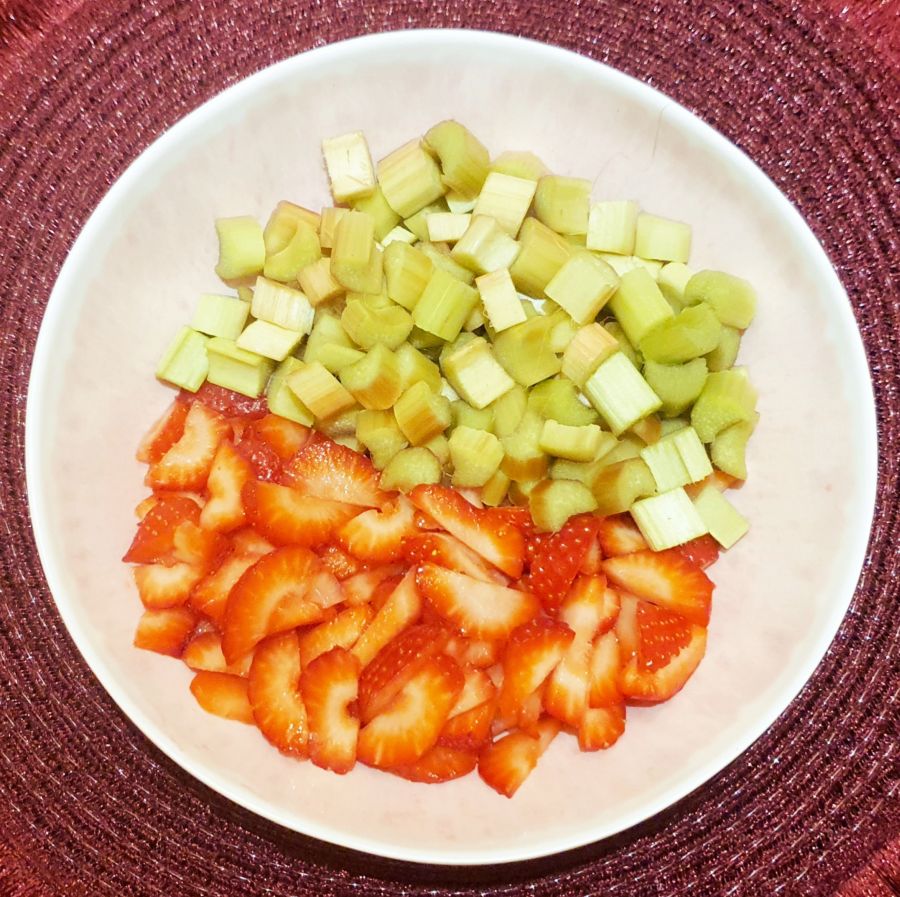 Für die Joghurt Rhabarbercreme, Rhabarber und Erdbeeren in kleine Stücke schneiden.
