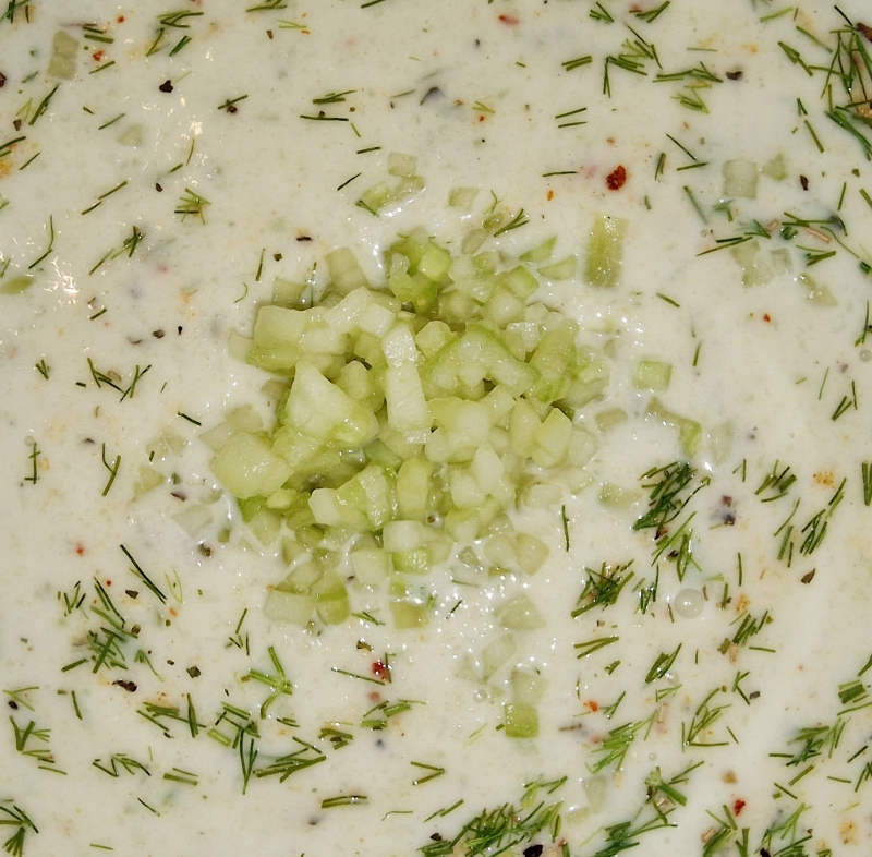 Mit Salz und Pfeffer, evtl. noch Gemüseliebling abschmecken. Petersilie, Dill und klein gewürfelte Gurken zuletzt hinzufügen.