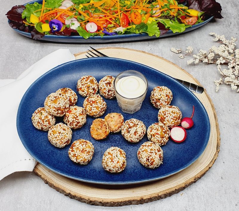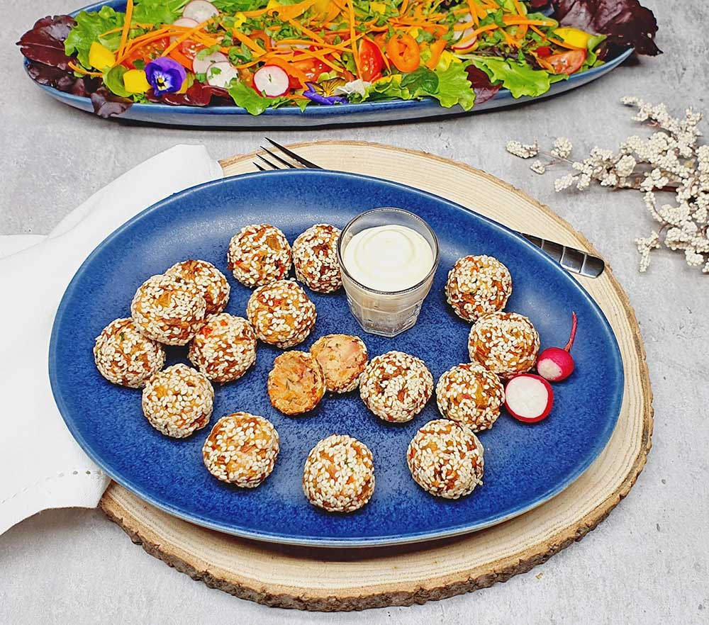 Dazu gabs:Knoblauchmajo - Majo, Cremefraiche, etwas Joghurt und Knoblauch pressen, Salz. Salat mit Mango, Tomaten, Radieschen, Paprika, Blattsalatmischung, Karotten und Blüten. Ergibt 2 Portionen als Hauptspeise.
