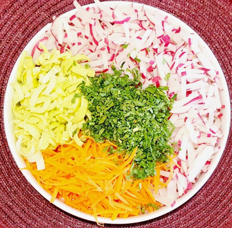 Radieschen, Karotten, und Frühlingszwiebeln klein stiftelig schneiden. Petersilie klein hacken und den Knoblauch pressen.