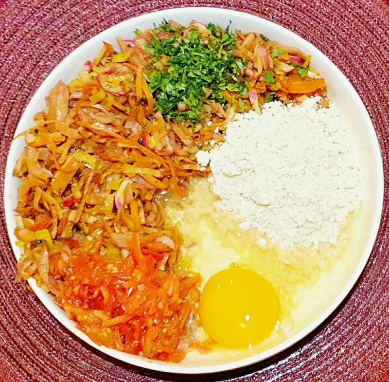 Die Tomaten klein schneiden und den Koriander fein (wer Koriander nicht mag - nochmal Petersilie) Tomaten und Koriander bleiben roh. Zitrusfaser und Toastbrotmischung hinzufügen. Danach das Ei und Eiklar. Salz und Pfeffer nach eigenem Geschmack.