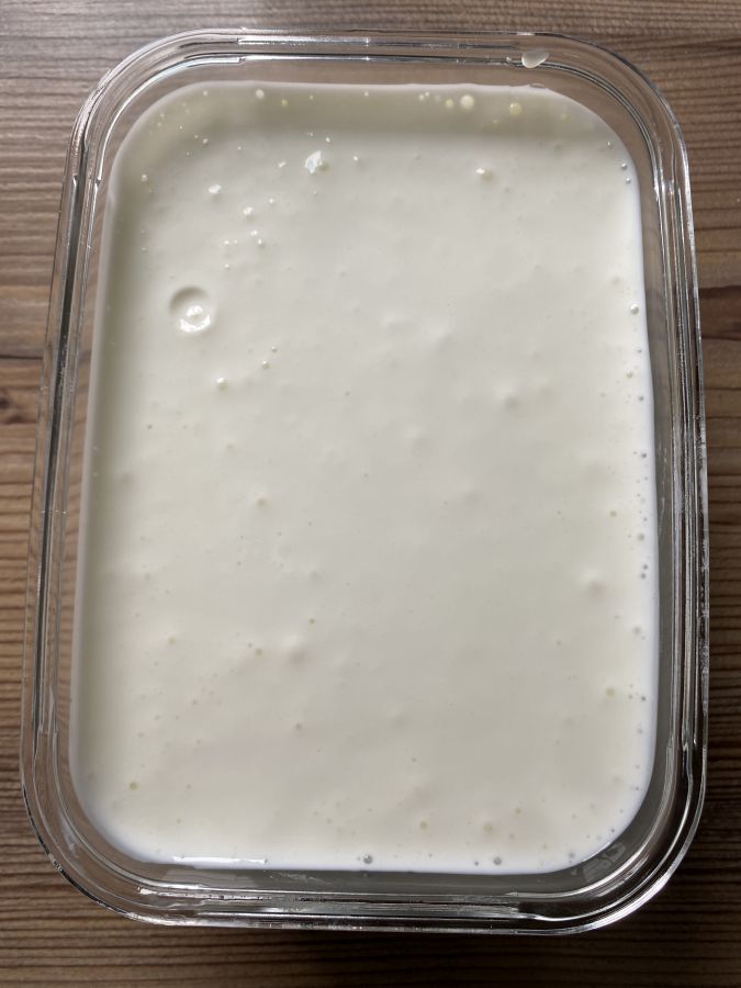 Den Teig in die Glasschüssel geben und am Boden verstreichen.