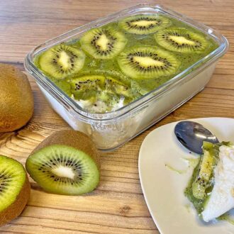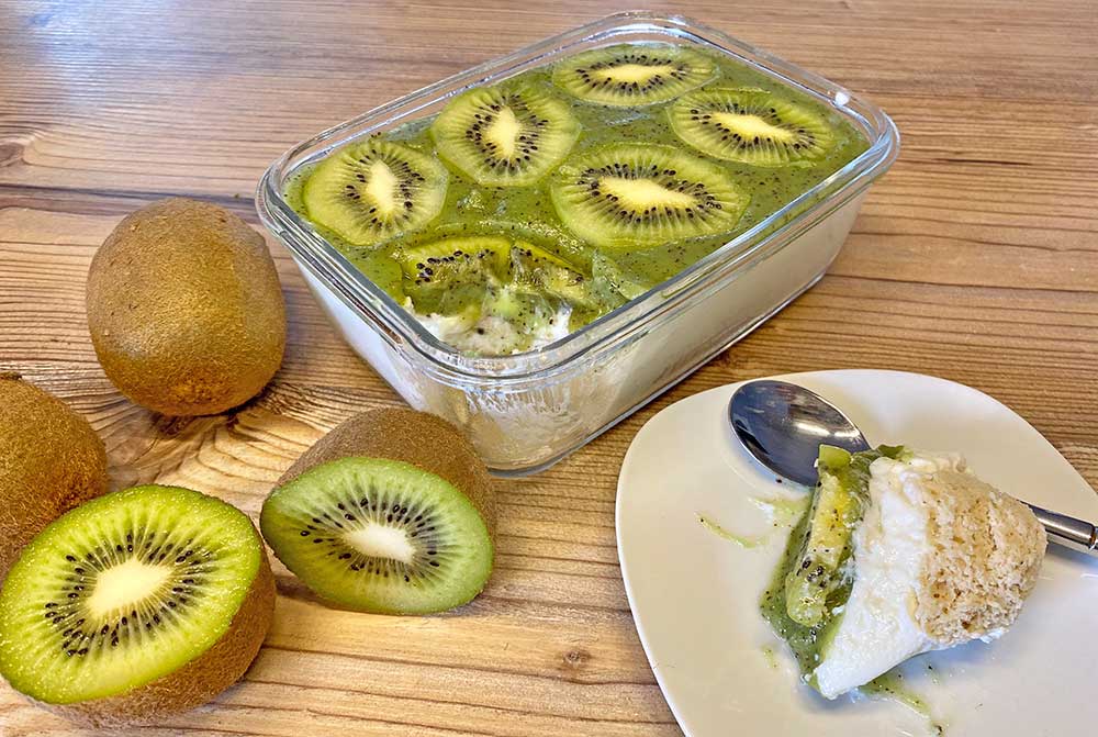 Kiwi schälen, in Scheiben schneiden und auf die Fruchtmasse geben. Alles gut erkalten lassen und genießen.