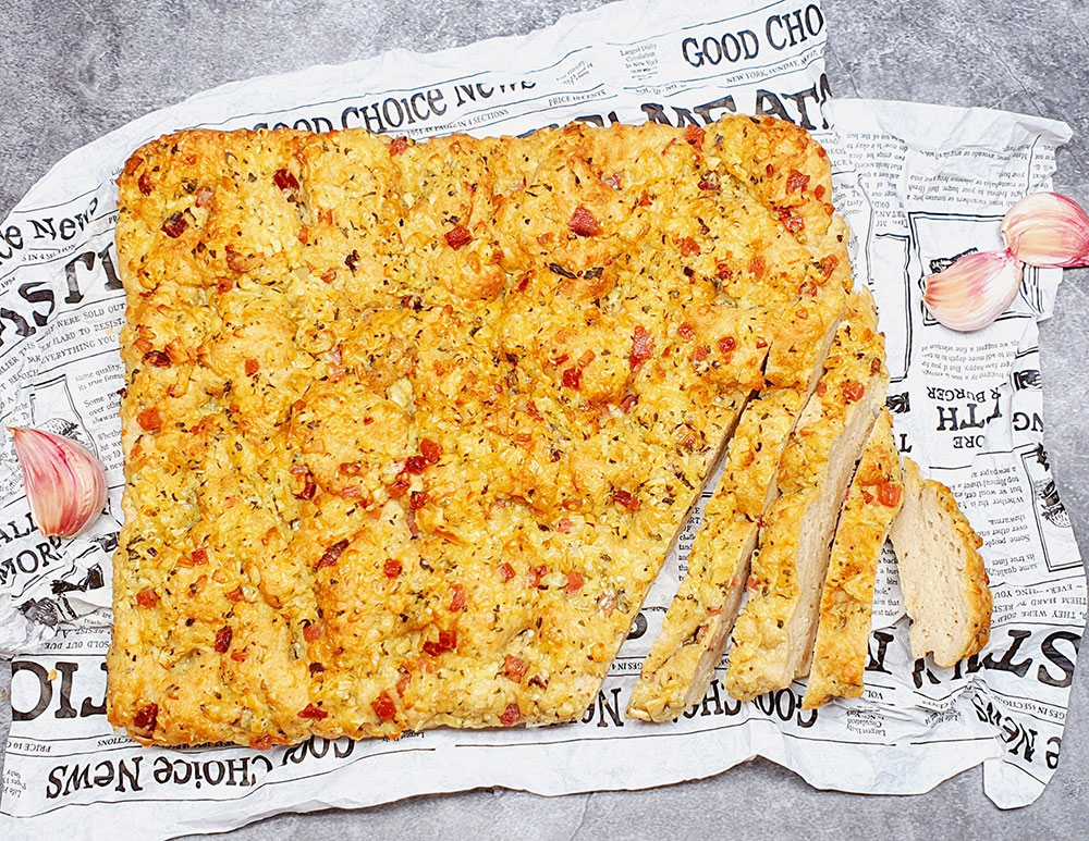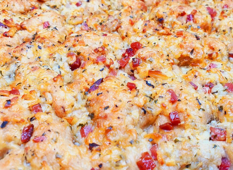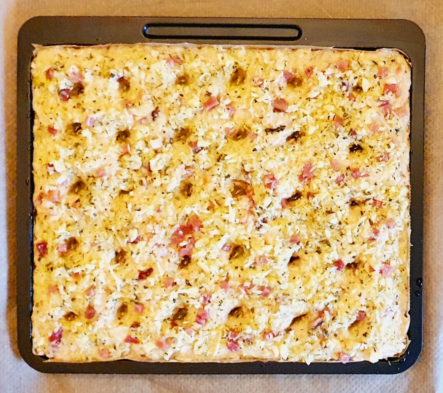In den Teig mit den Fingern tiefe Kuhlen machen und mit gewürfeltem Speck bestreuen.