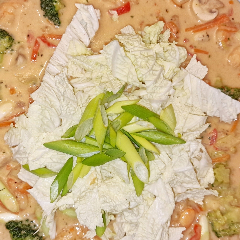 Dann Suppentraum einrühren, danach den Chinakohl und den grünen Teil von Frühlingswiebel hinzufügen.