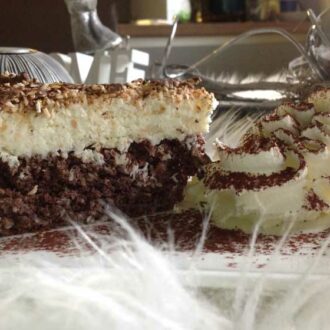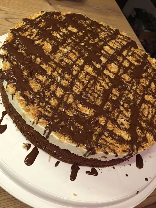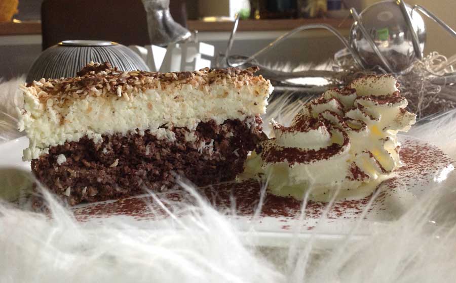 Die Kokosraspel in einer Pfanne mit dem Erythritol karamellisieren. Abkühlen lassen und auf der Torte verteilen.