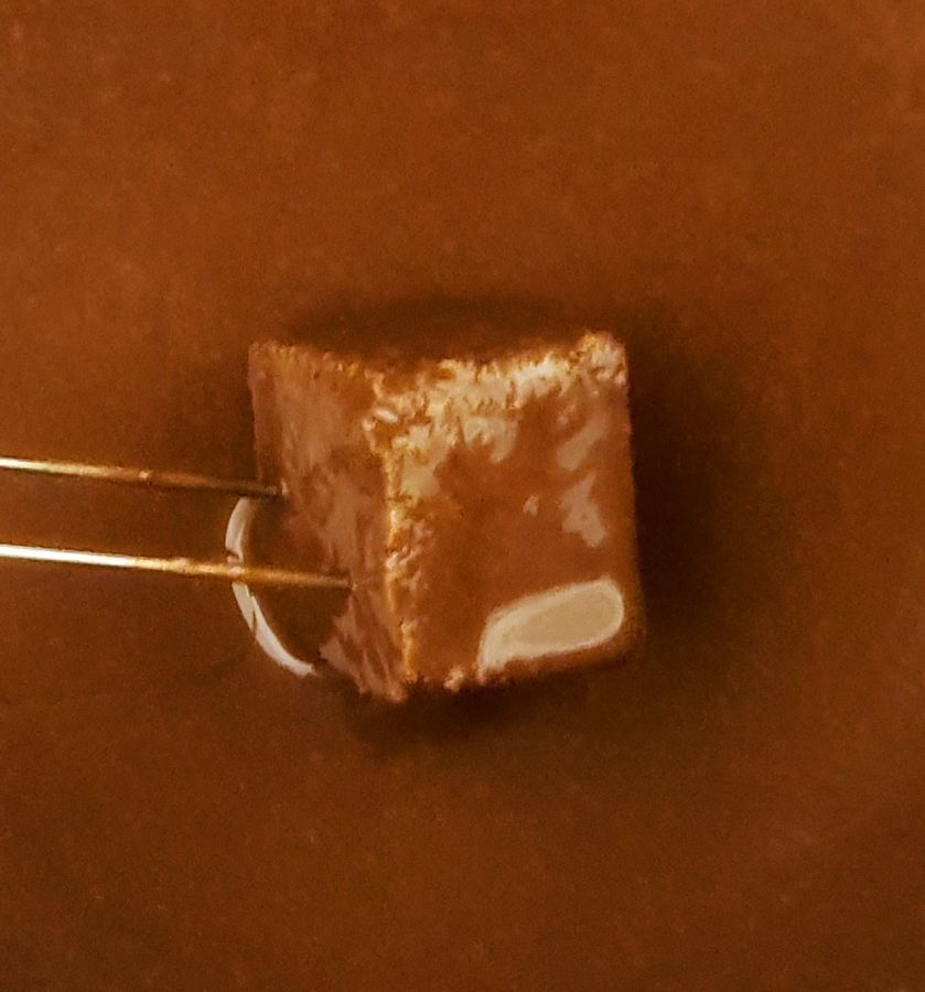 Mit einer Pralinengabel immer 4 Würfel in den Schmelztopf legen und gut 5 Minuten (geht länger auch), in der Schokotunke ziehen lassen. Mit einer Pralinengabel aufspießen und abtropfen lassen.