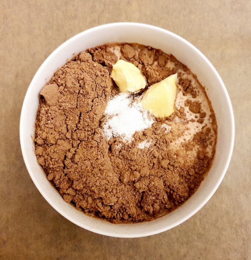 In der Zwischenzeit einen Topf mit Wasser vorbereiten und erhitzen. In einen Schmelztopf Schokoladenzauber, Butter, Milch, Kakao, Low Carb Süße und Rum füllen.