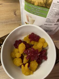 Alles zusammen erwärmen, kurz aufkochen, vom Feuer nehmen und gut durchrühren, bis sich alles gelöst hat. Nach Belieben ein paar Tropfen Lebensmittelfarbe unterrühren.