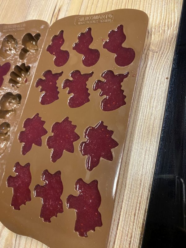In geeignete Silikonformen füllen (Links siehe oben beim Equipment) und im Kühlschrank ca. 2 Stunden gut durchkühlen!