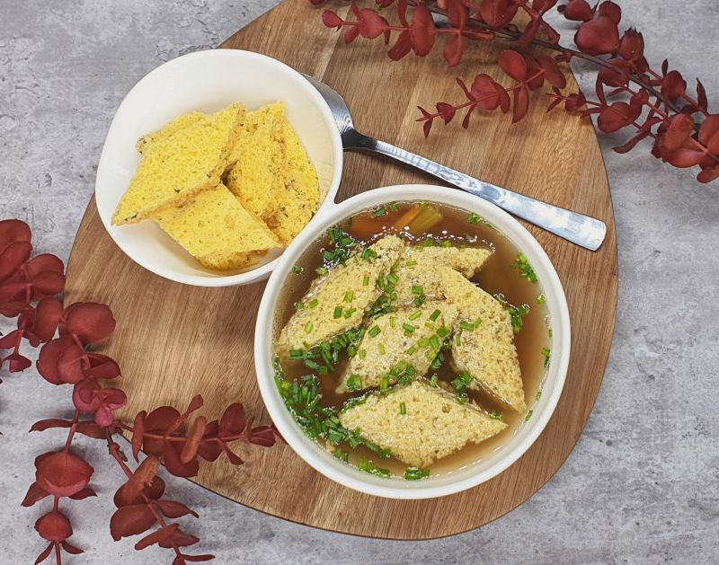 Das Blech reicht für 8 Portionen. Was übrig bleibt, kann zwischen Backpapierlagen in einem Becher eingefroren werden. Taut schnell auf, kann auch gefroren in die heiße Suppe gelegt werden.