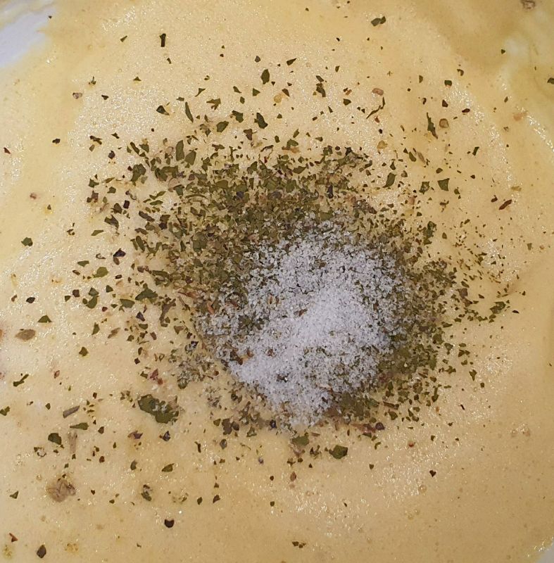 Mandelstaub 1 x sieben und mit Salz und Gewürzen vorsichtig unter die Eimasse heben.