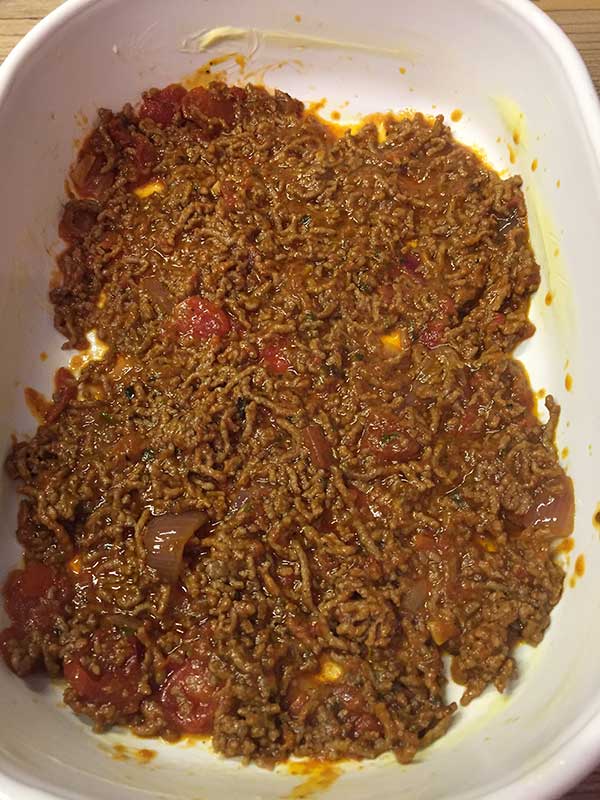 Wenn die Zwiebeln glasig und das Hackfleisch vollständig durchgebraten ist: mit Rotwein ablöschen und den Senf unterrühren. Ein paar Minuten schmoren lassen, das Tomatenmark zugeben und gut unterrühren.