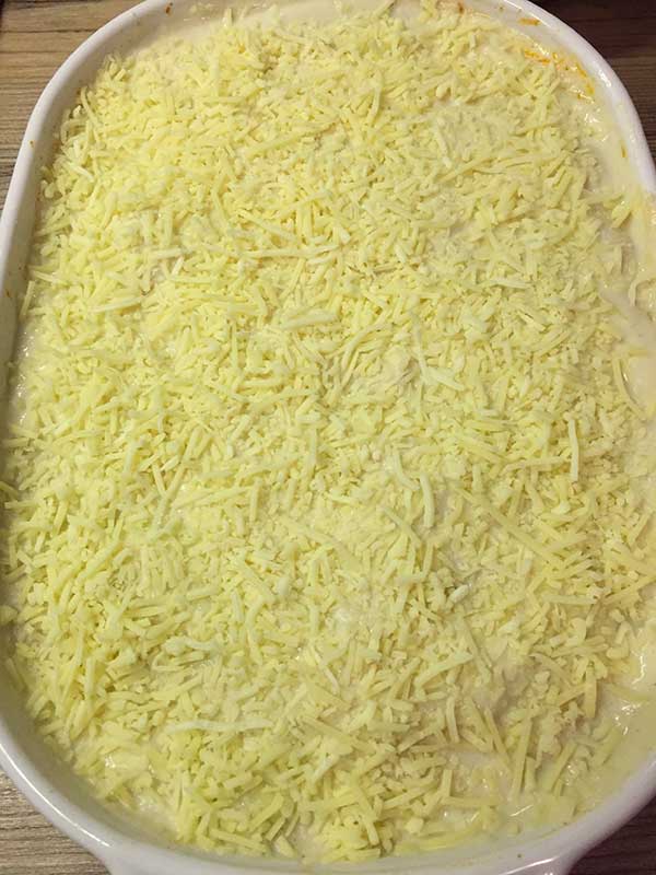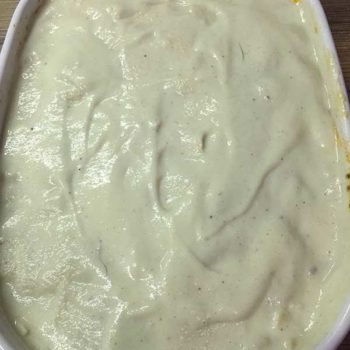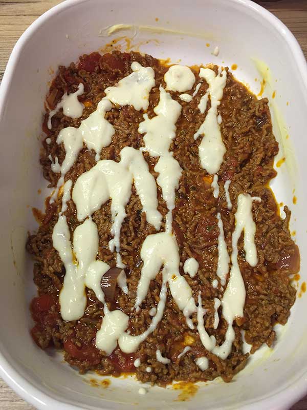 Nach der letzten Schicht Nudeln, oben nur noch Bechamel darauf geben und dann den Mozarella (oder anderen Käse Deiner Wahl)
