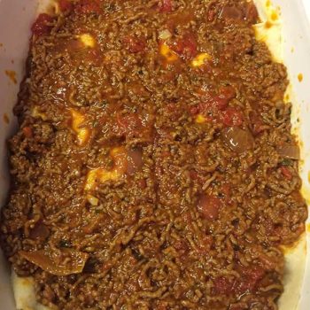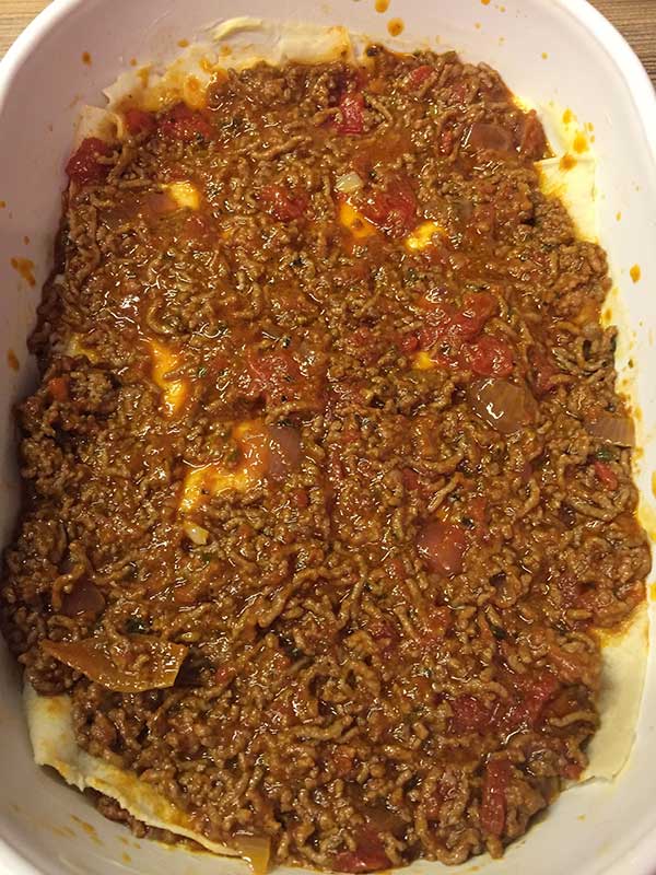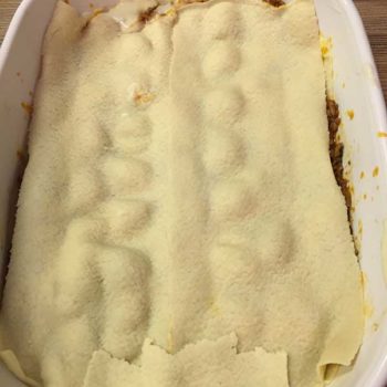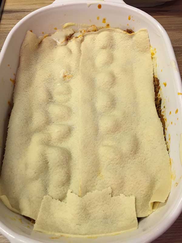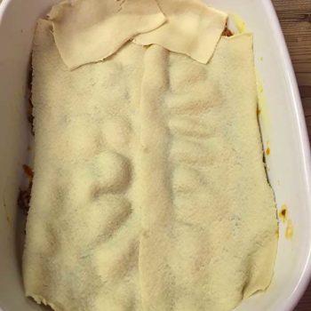 Bolognese, Bechamel und Nudelplatten immer abwechselnd schichten! Immer mit Bolognese und Bechamel beginnen, dann pappen die Nudeln nicht am Boden fest.