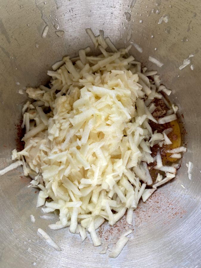Aus Lebkuchenzauber, gehackten Nüssen, geraspelten Äpfeln, Eiern, Nuketo, Kakaopulver, Karamelltraum und Pure Flavour einen Teig zubereiten. Einfach alles gut verrühren.