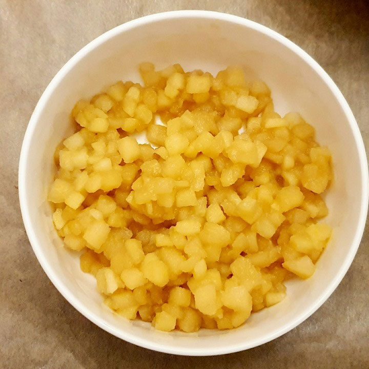 Für die Karamelläpfel Apfel klein würfeln und mit Zitronensaft vermischen. Butter und Karamelltraum in einer Pfanne schmelzen, die Apfelwürfel hinzufügen und so lange köcheln bis die Flüssigkeit verkocht ist, geht ganz schnell.