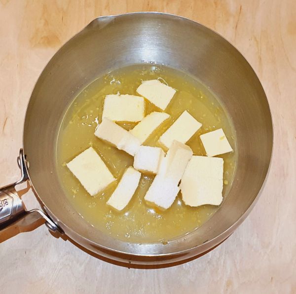 Zur Seite stellen, paar Minuten abkühlen lassen und die kalte Butter + Salz hinzufügen. Nochmal aufkochen.