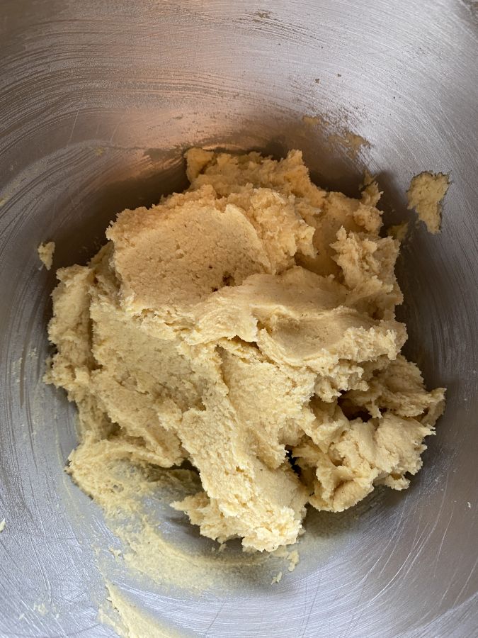 In einer Schüssel Butter klein würfeln, Mandelstaub, Kuchenzauber, Bambusfaser, Vanillepudding, Süße, Vanilletraum, und Aroma mit der Butter bröselig verkneten.