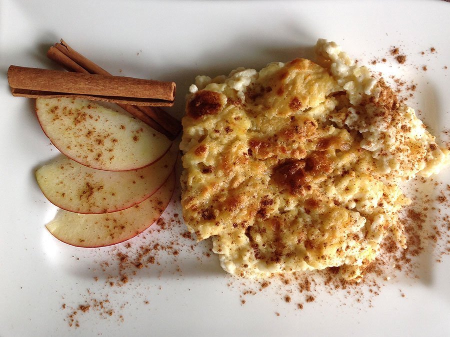 400 ml Milch mit 10g Vanillepuddingpulver und der Süße erhitzen und in die Form gießen, Butterflocken darauf setzen.