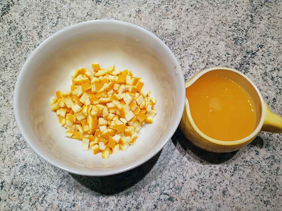 Die Schalen auf Backpapier verteilen und abkühlen lassen. Für längere Lagerung sollten sie noch einige Stunden getrocknet werden, für die Verwendung in Rezepten können Sie direkt so verwendet werden. TIPP: Für Rezepte empfehlen wir, die Würfel nochmals feiner zu zerhacken (auf ca. 2 mm).