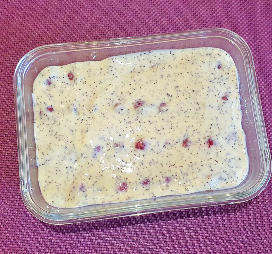 1/5 der Creme mit Mohnfix vermischen und über die Himbeeren gießen.