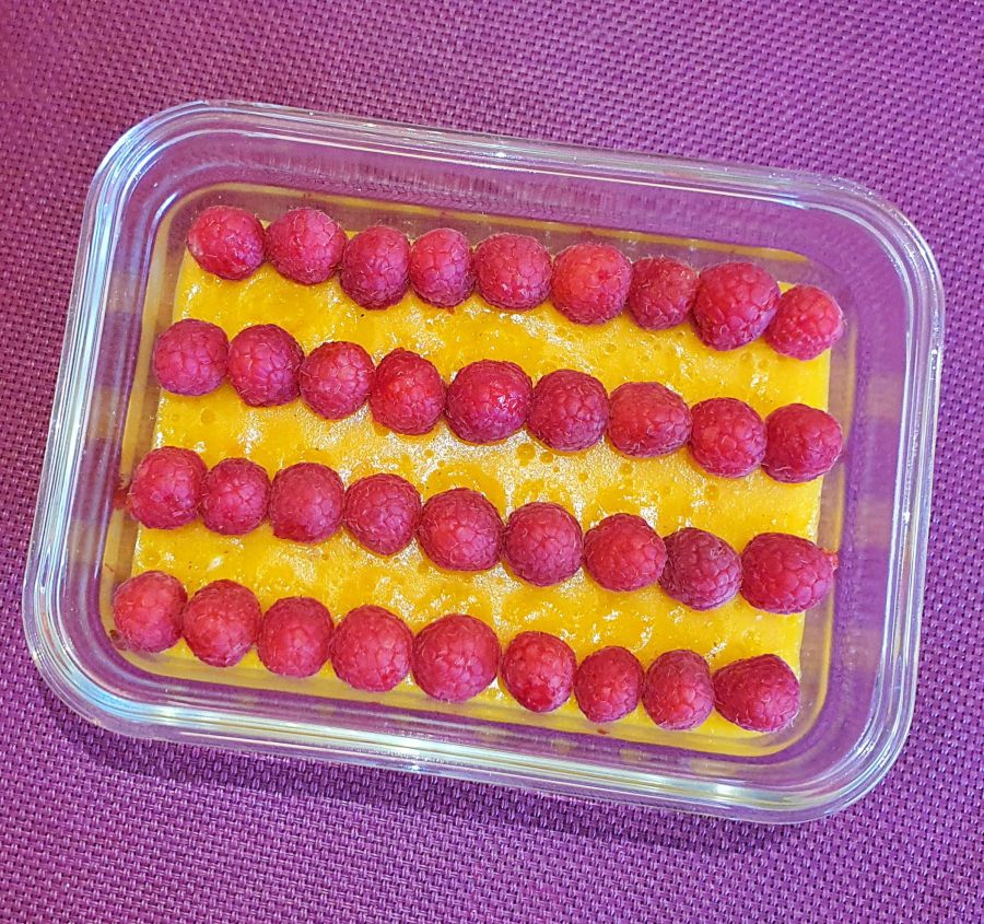Zum Fertigstellen Himbeeren in 4 Reihen in der Bowl aufteilen.