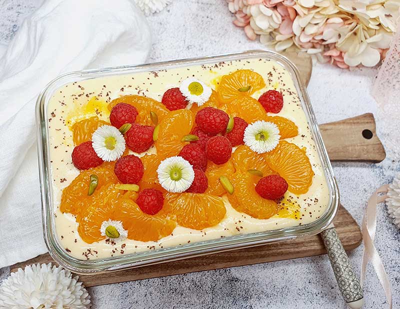 Nach Lust und Laune oben dekorieren (Mandarinen, Himbeeren, Pistazien usw.)