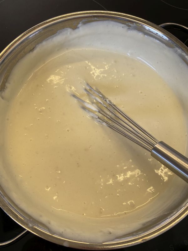 Sofort Schmand hinzugeben, unter Rühren nochmal erhitzen und rühren bis eine schöne homogene Masse entstanden ist.