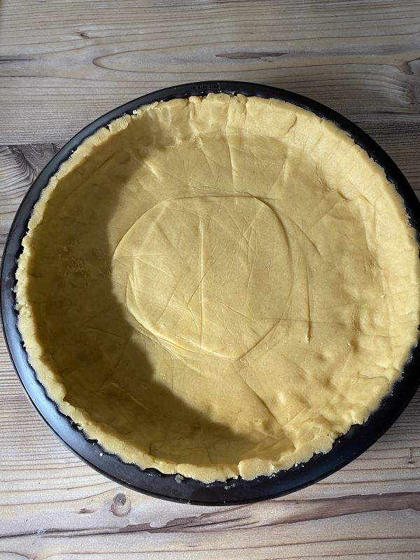 In einer antihaftbeschichteten Quicheform/Springform den Teig ausrollen und die Ränder hochziehen. Bei normalen Formen ohne Antihaftbeschichtung den Boden mit Backpapier auslegen und den Rand einfetten.