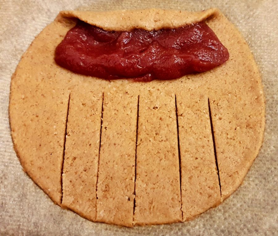 Teig aus dem Kühlschrank holen und gut 15 Minuten bei Zimmertemperatur entspannen lassen. Einmal durchkneten. Dann zwischen zwei Blatt Backpapier ca. halben Zentimeter dick ausrollen. Mit einer Schüssel 12 cm Kreise ausstechen.
