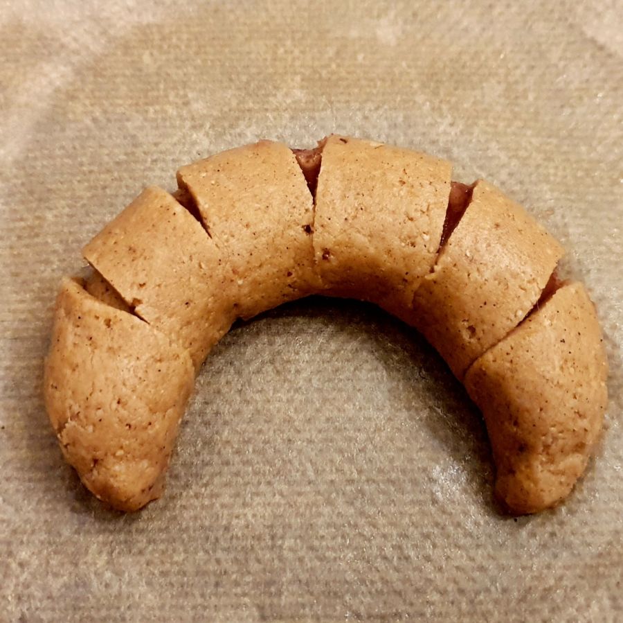 Aufgerollt dann zu einem Hörnchen formen, die Enden verschließen.