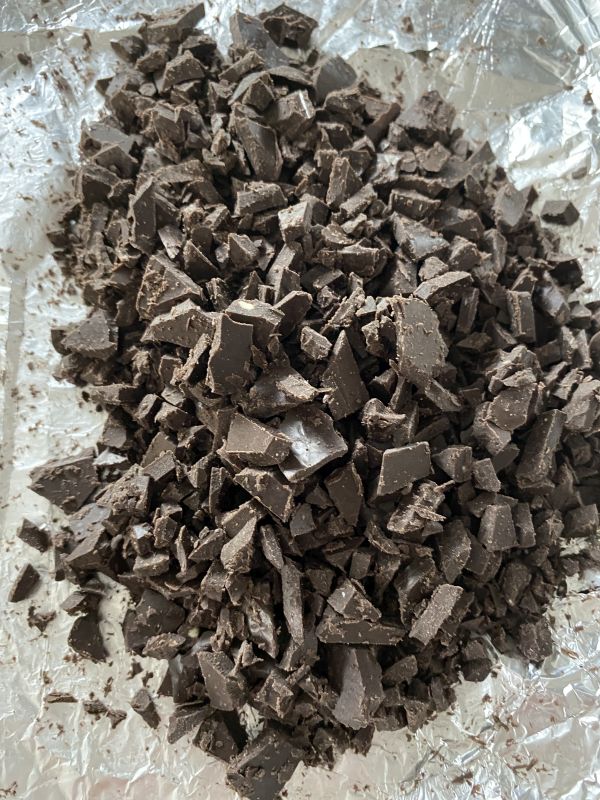 Die Schokoladenplatte mit einem Messer in kleine Stücke zerhacken und wieder im Kühlschrank kalt stellen.