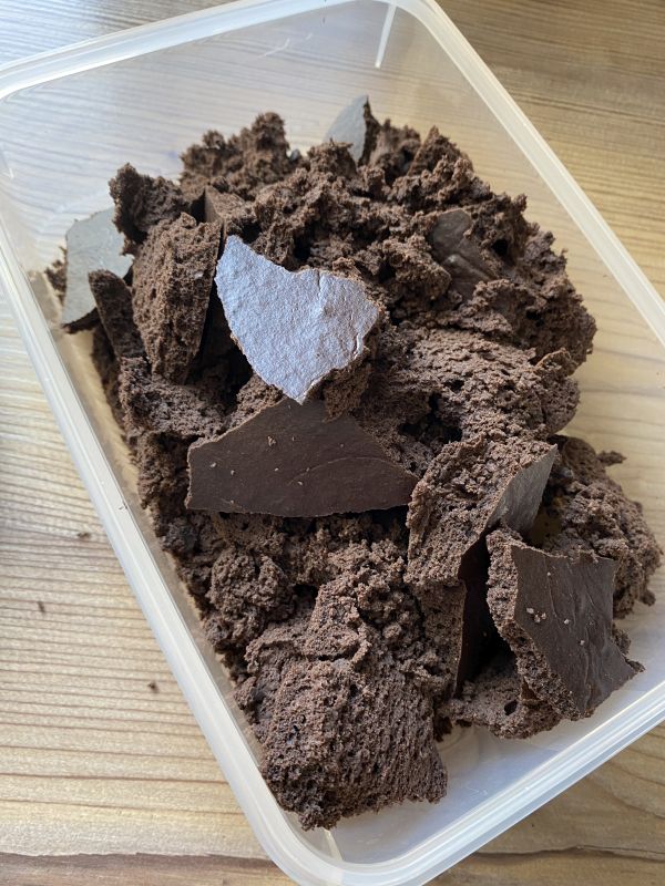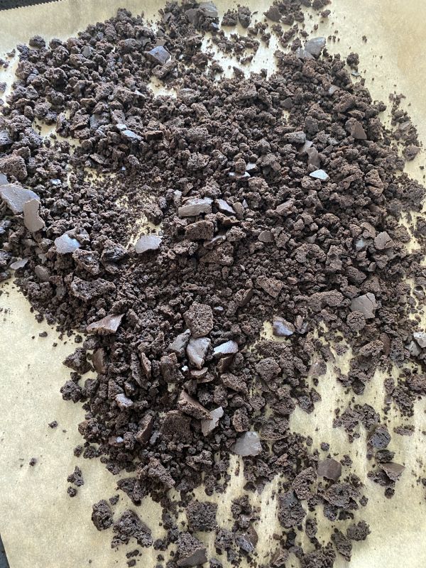 Die Kuchenstücke auf ein mit Backpapier ausgelegtes Backblech geben und bei 80 Grad im Backrohr etwas trocknen (45-60 Minuten). So lässt sich der Boden leichter zerbröseln.