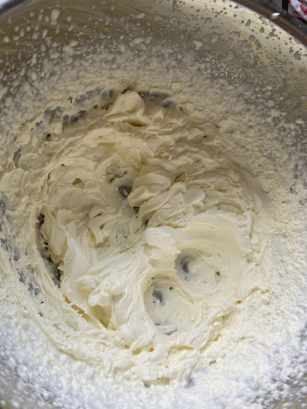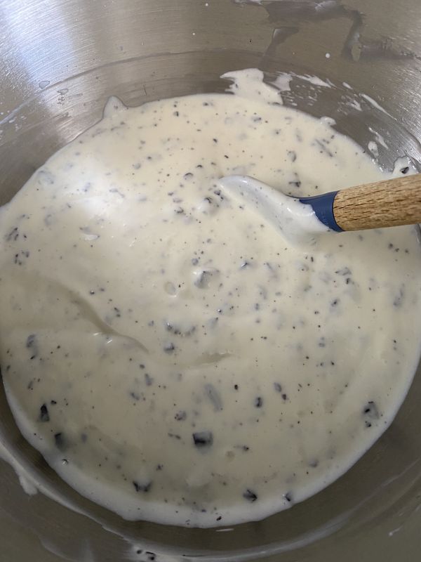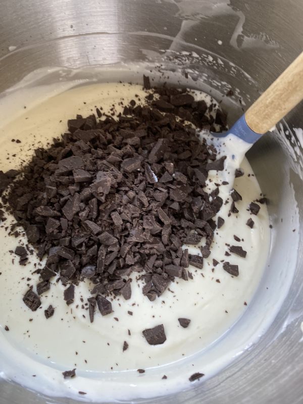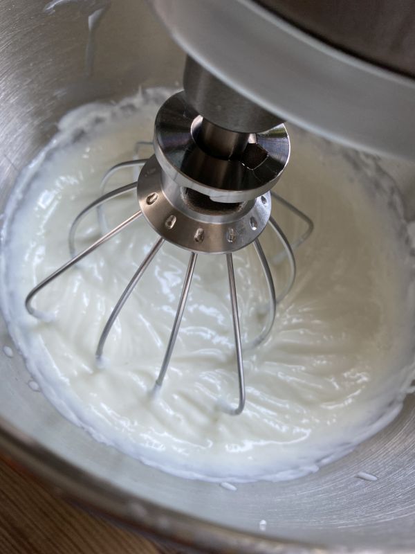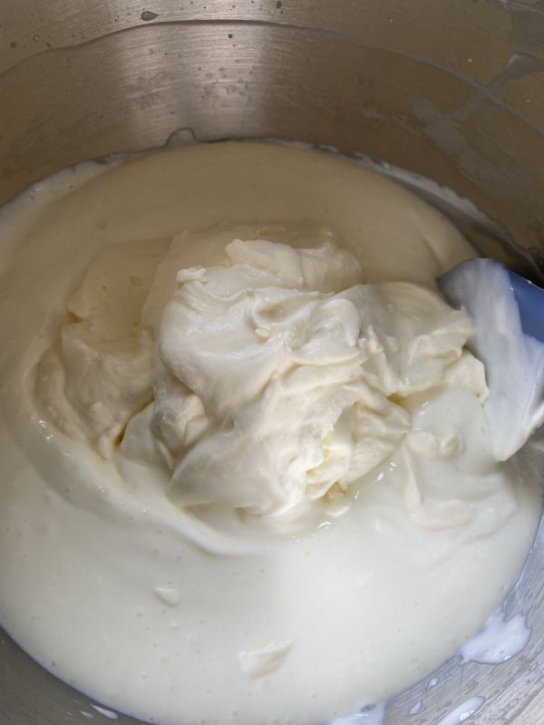 Dies komplett unter ständigen Rühren unter den Rest der Creme geben.