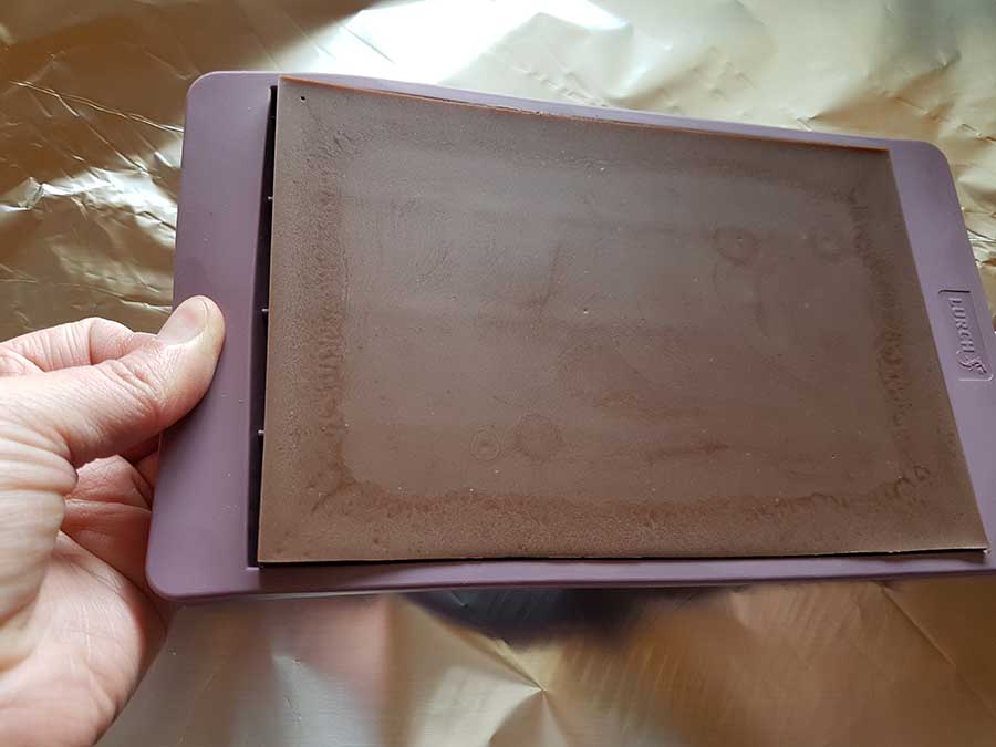 Mit Süßstoff und Vanille abschmecken und auf ca. 26 - 28 °C abkühlen lassen, dabei immer wieder verrühren. Wenn die Schokoladenmasse allmählich immer dickflüssiger wird, alles in die Tafelform gießen und in den Kühlschrank stellen.