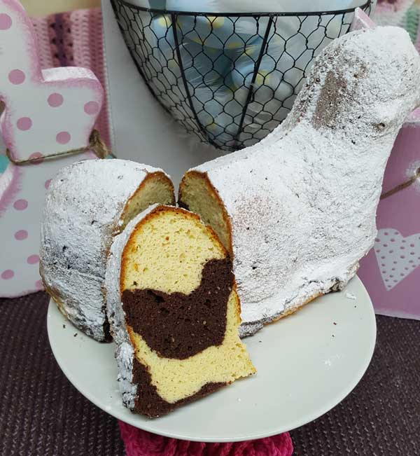 Das Eierliköraroma (oder andere Aromen) unter die erste Hälfte rühren. Dieser Schritt entfällt wenn man nur ein einfaches Marmorlamm möchte.