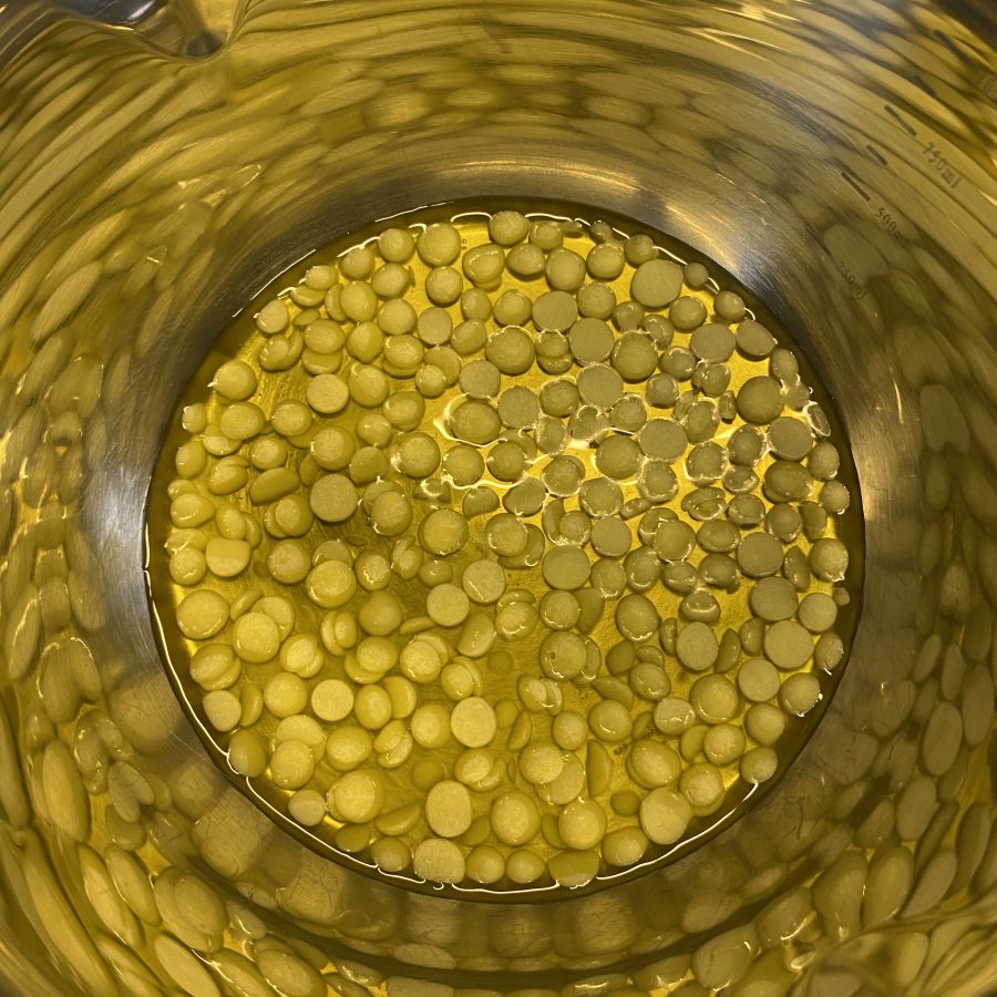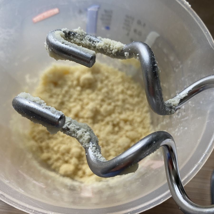 Kurz etwas mit Knethaken eines Handmixers vermischen, so dass die Kakaobutter gut verteilt ist.