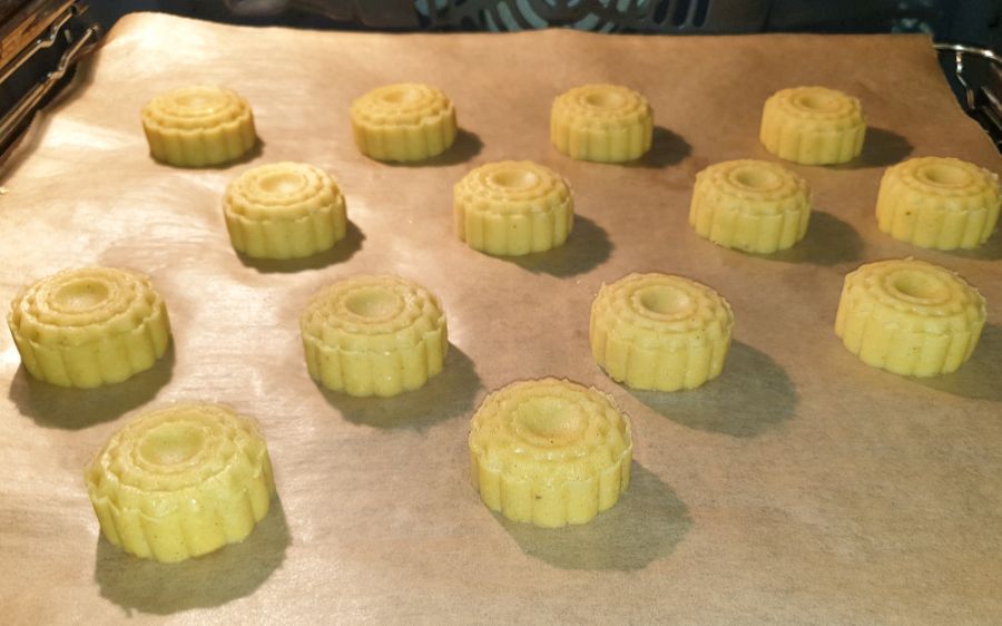 Anschließend in die Maamoul Form legen und den fertigen Keks auf ein mit Backpapier ausgelegtes Backblech drücken. Tipp: bei anderen Förmchen, bei denen der Teig anklebt, kann man die Form mit einem Stück Frischhaltefolie auslegen.