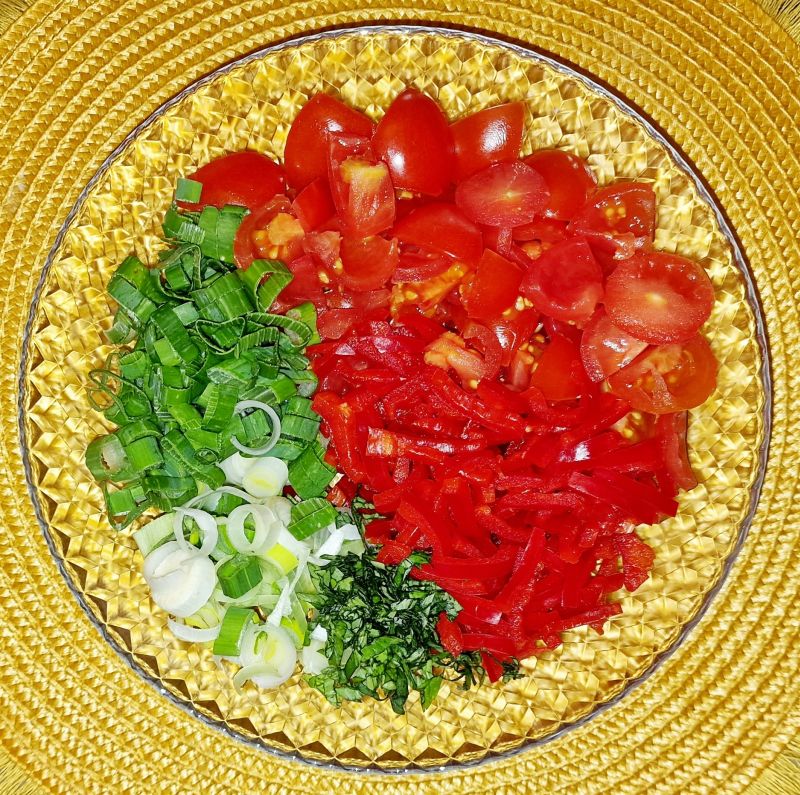 Für die Fülle Tomaten, Paprika, Zwiebel und Basilikum klein schneiden.