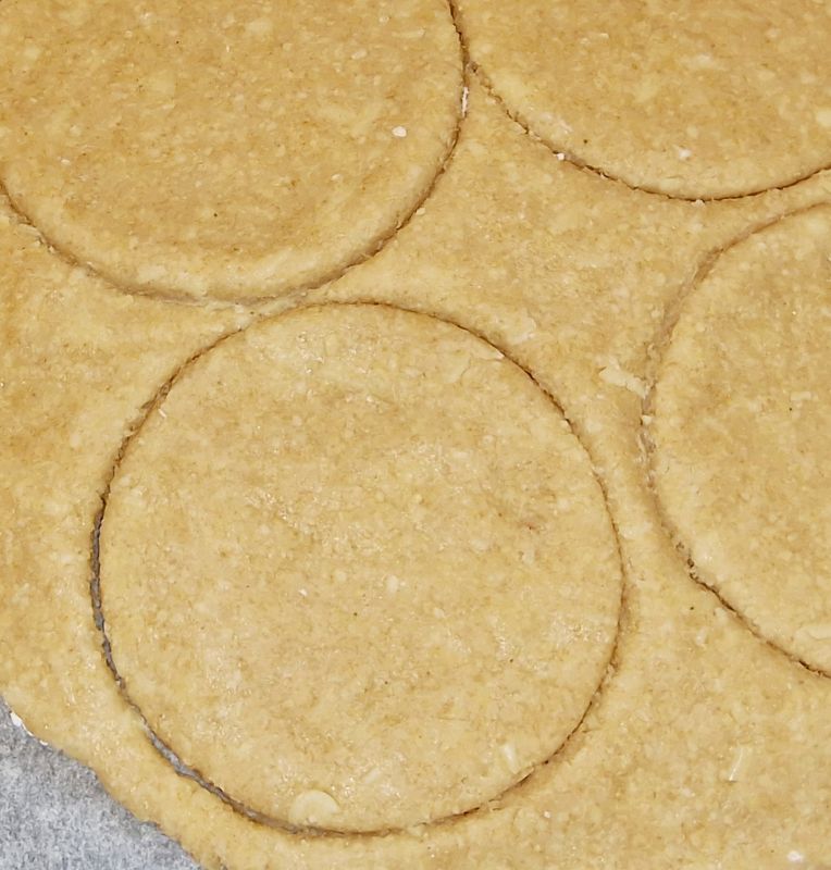 Den Teig zwischen zwei Blatt Backpapier, welches mit Bambusfaser leicht bemehlt ist, nicht zu dünn ausrollen. Runde Kreise 12 cm ausstechen.