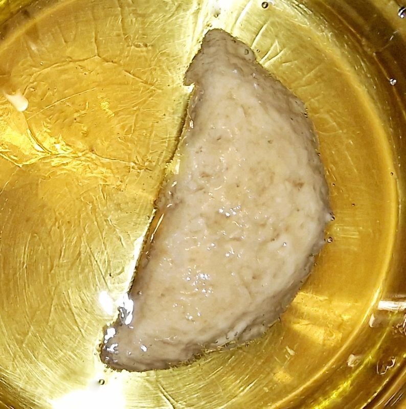 Den ausgestochenen Kreis etwas flacher drücken und die Ränder mit Wasser bestreichen, 1 EL Fülle mittig auf den Kreis setzen und zusammenklappen.