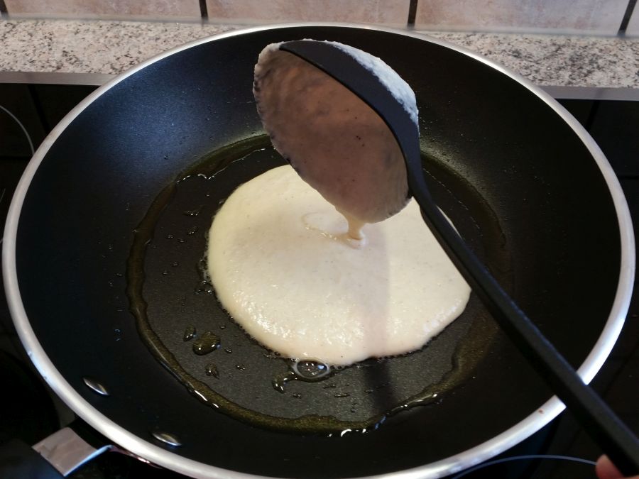 Eine Portion in die Mitte der Pfanne geben. Der Pfannkuchen sollte nur so groß sein, dass du am Rand noch genug Platz hast, um den Pfannenwender darunter zu schieben. Bei uns gelingen die Pfannkuchen am besten, wenn sie ca. 15 – 20 cm Durchmesser haben.