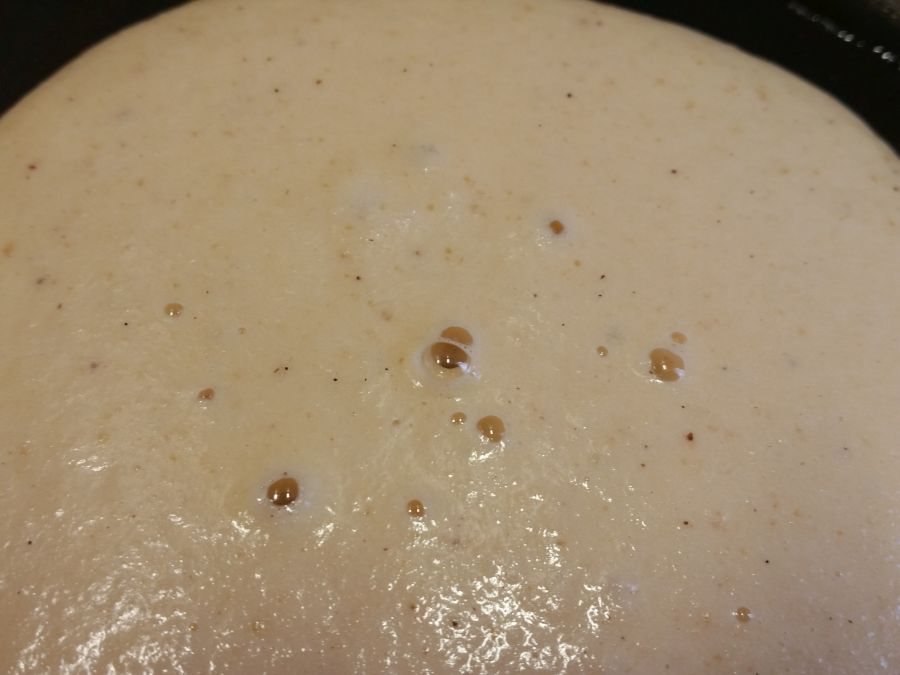 Jetzt heisst es, den richtigen Zeitpunkt zum Wenden abzuwarten. Wenn sich auf der Oberfläche vermehrt Bläschen bilden und die meisten dieser Bläschen geplatzt sind, ist es genau richtig.