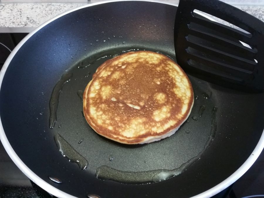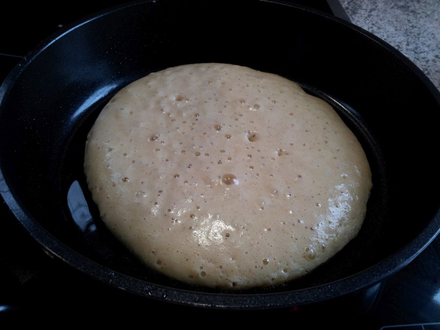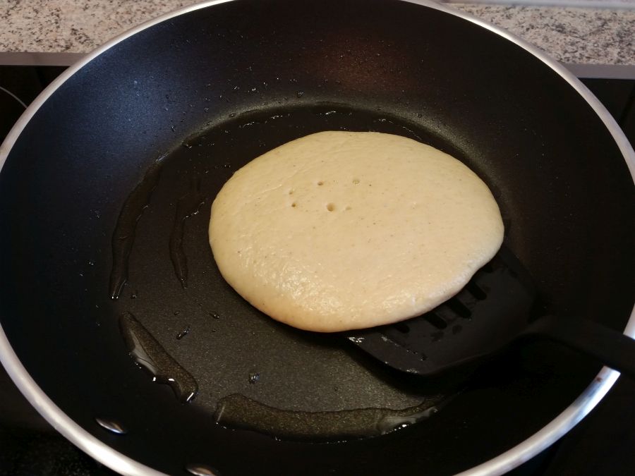 Etwas Kokosöl oder Butterschmalz (keine Butter!) in einer Pfanne erhitzen. Es ist wichtig, dass du eine Pfanne mit guter Antihaftbeschichtung verwendest, da eiweissreiche Teige sehr gerne ankleben. Der Herd sollte auf mittlere Hitze eingestellt sein.