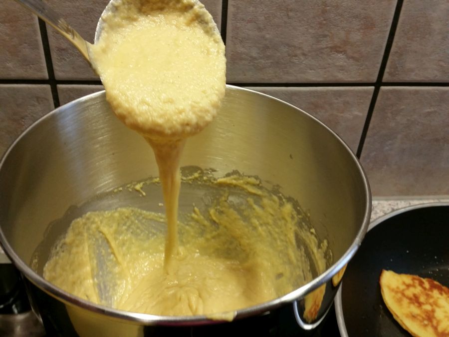 Kontrolliere, ob der Teig die richtige Konsistenz hat. Er sollte zähflüssig von Löffel reissen. Wenn der Teig zu fest ist, kannst du mit etwas Sahne oder Wasser nachhelfen.