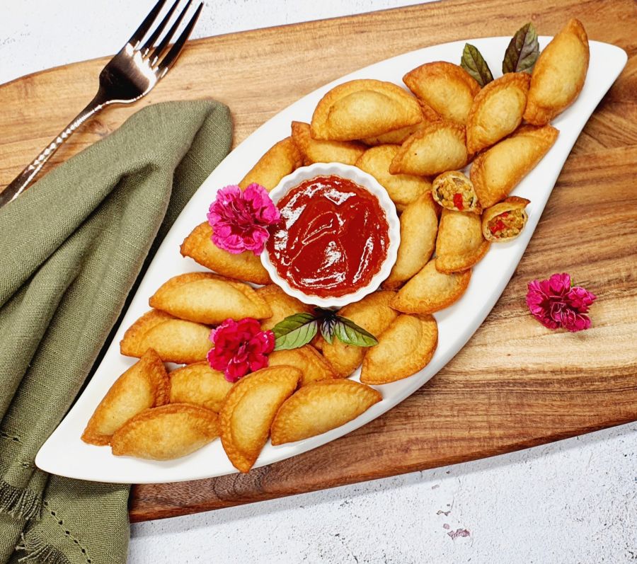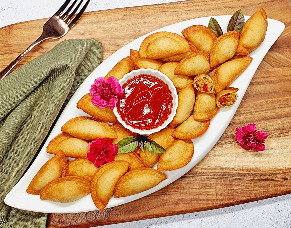 Speiseöl in einem Topf erhitzen und die Teigtaschen für 2 Minuten im sehr heißen Öl anfrittieren lassen. Aus dem Öl nehmen auf Küchenrolle abtropfen lassen.