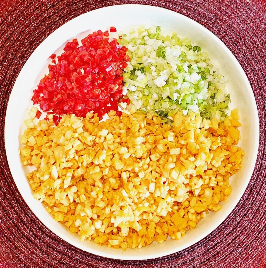 Frühlingszwiebel und Rote Paprika auch klein würfeln. Knoblauch pressen.