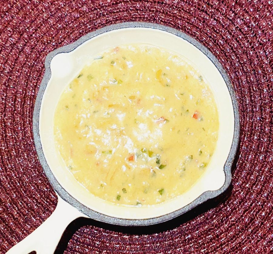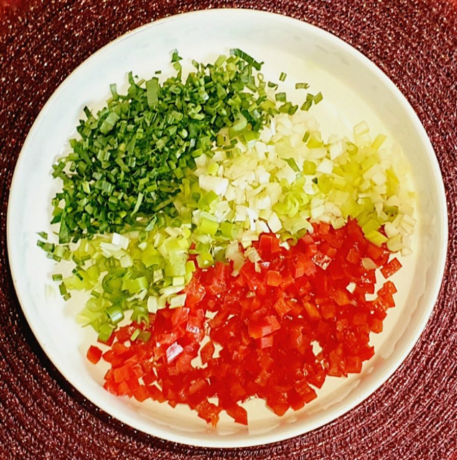 Ghee in einer Pfanne schmelzen und die Pfifferlinge anbraten. Dann Frühlingszwiebel, rote Paprika und Petersilie klein schneiden. Mit den Pfifferlingen vermischen und zur Seite stellen.